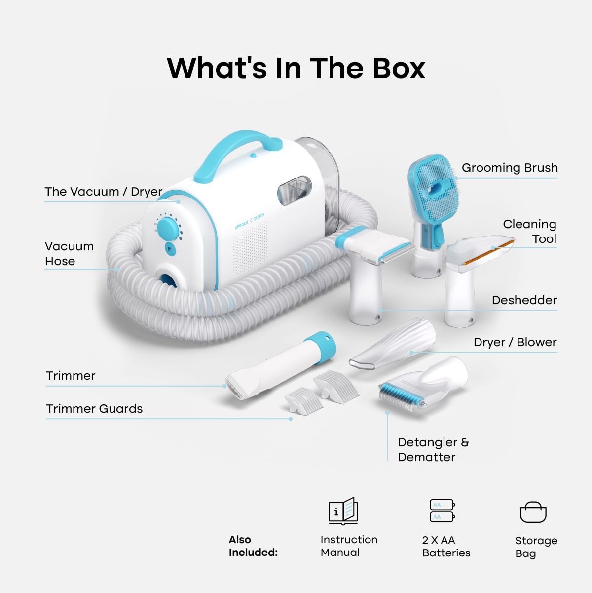 This 7-IN-1 versatile vacuum kit comes with: the vacuum/dryer, a vacuum hose, grooming brush, cleaning tool, deshedder, dryer/blower, detangler & dematter, trimmer, 4x trimmer guards, 2x AA Batteries, storage bag, and instruction manual.