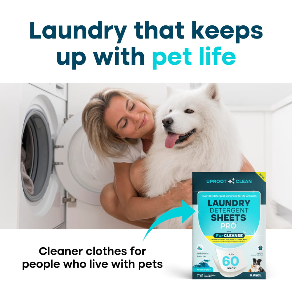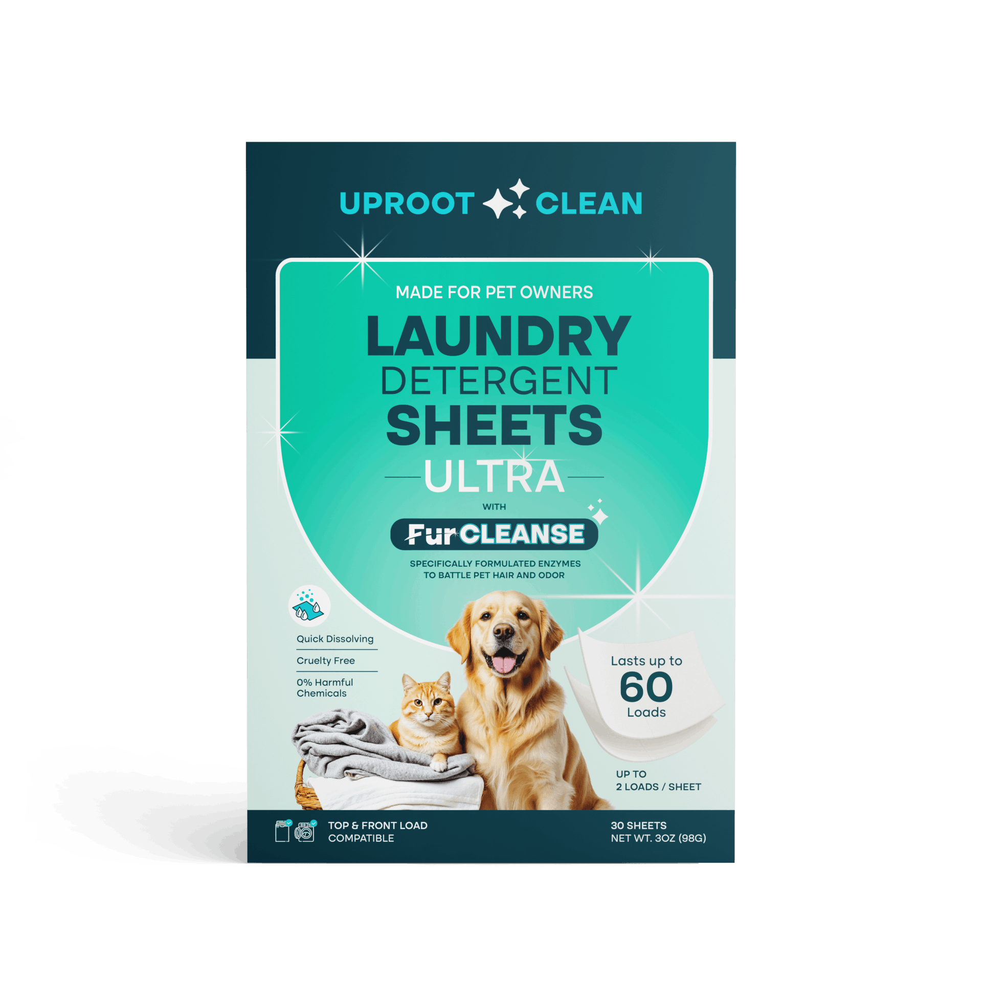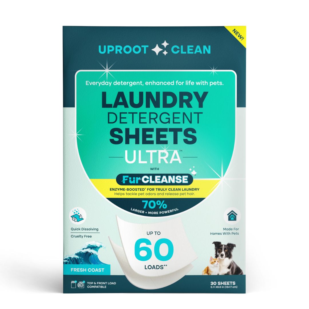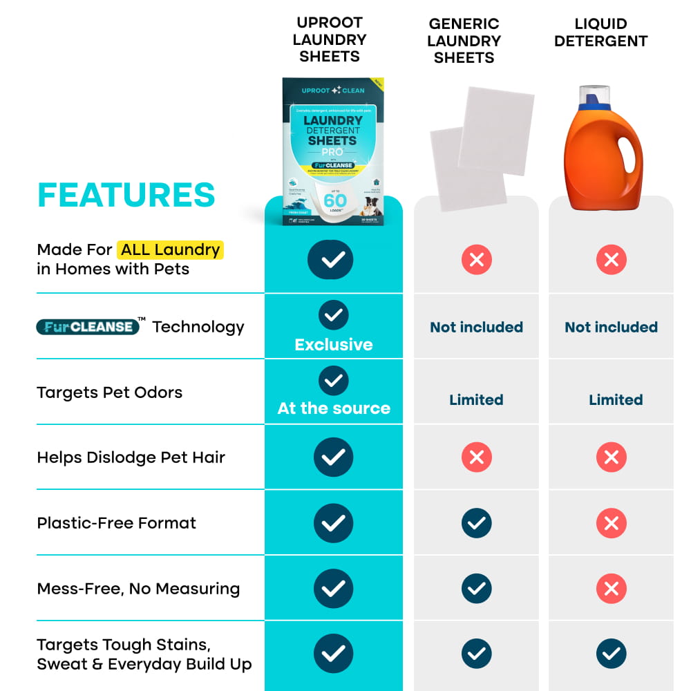Everything a normal detergent does, plus more Uproot Laundry Sheets handle pet odor and hair on top of everything you expect from a regular detergent, without sacrificing everyday cleaning performance.