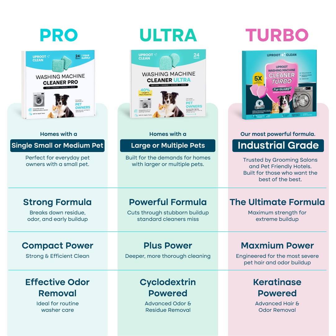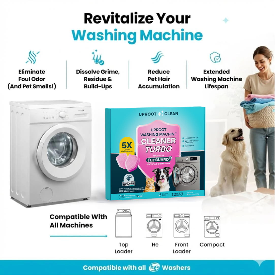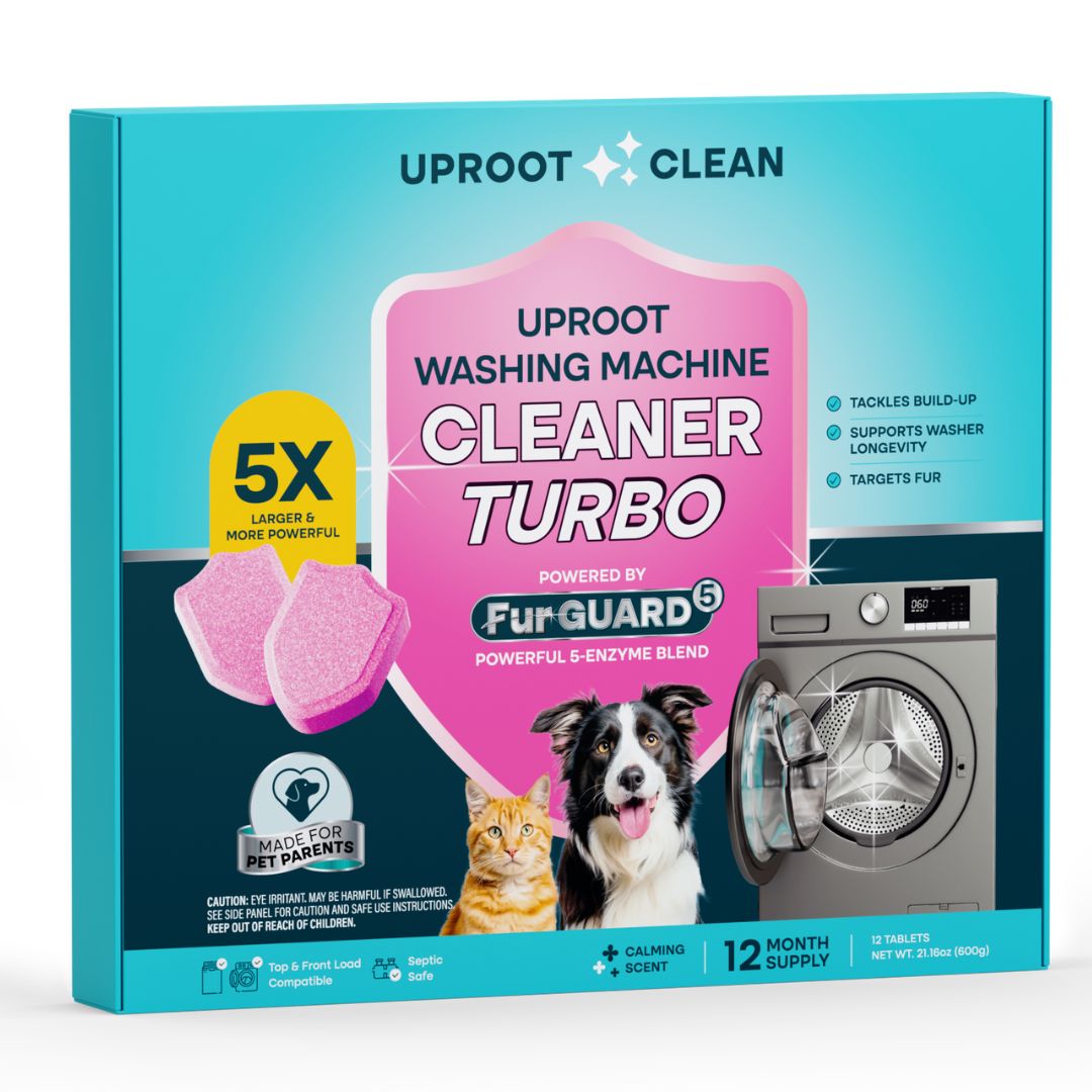 The Uproot Washing Machine Cleaner Pro is a tablet formulated specifically to clean washing machines that have pet hair, pet odor, detergent, softener and fabric residue in them. In addition, it kills 99.9% of leftover bacteria and germs in the machine post washing machine cycle.