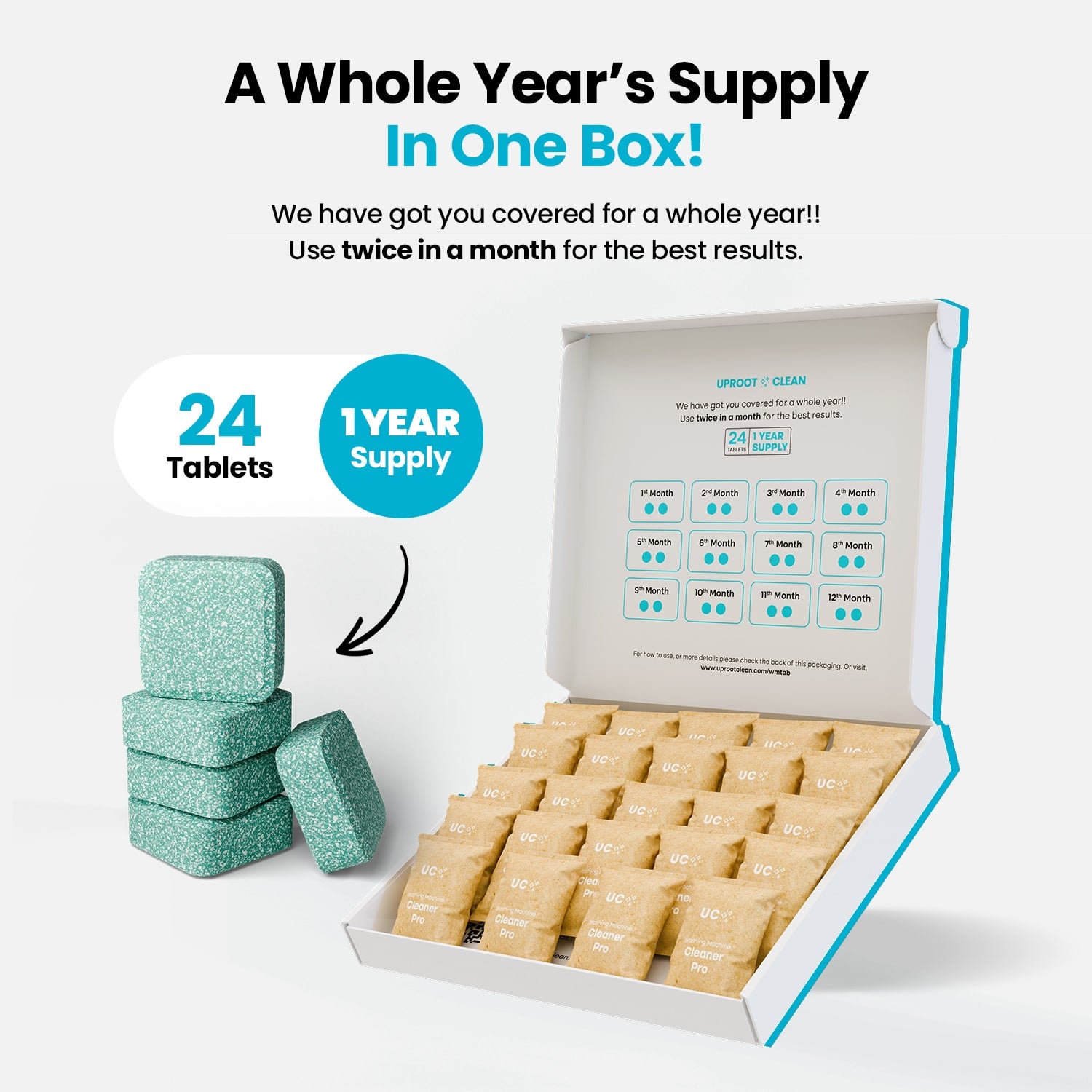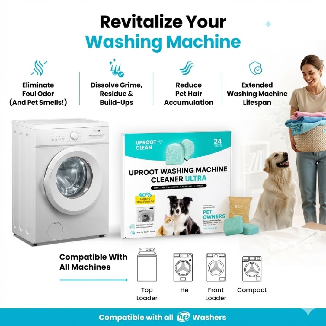 The Uproot Washing Machine Cleaner Pro is a tablet formulated specifically to clean washing machines that have pet hair, pet odor, detergent, softener and fabric residue in them. In addition, it kills 99.9% of leftover bacteria and germs in the machine post washing machine cycle.