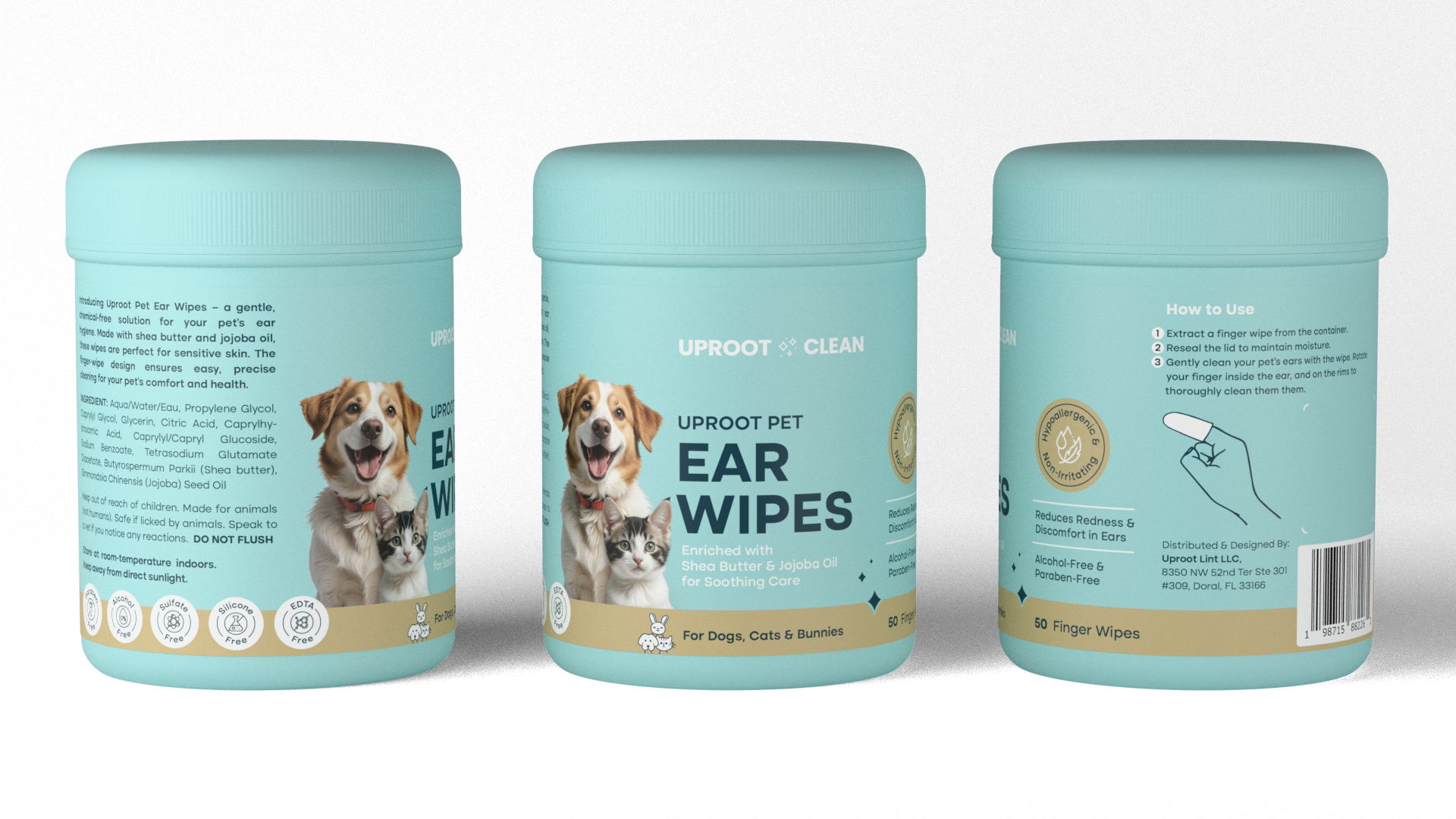 The Uproot Ear Wipes are crafted with safe, pet-friendly ingredients that prioritize health and comfort. Free from harsh chemicals like parabens, alcohol, and silicones, the formula ensures a gentle yet effective clean for sensitive ears. Natural moisturizers like shea butter and jojoba oil nourish and protect delicate skin, preventing irritation or dryness. With a pH-balanced composition and hypoallergenic properties, these wipes maintain the natural integrity of your pet's ears while delivering a clean, fresh feel.
